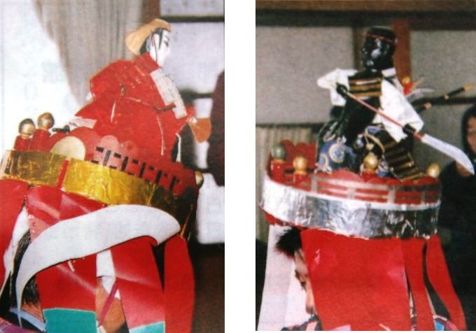 写真は那須町広報に以前掲載されたもの。2人の演者の頭上に注目!30cmほどの人形は義経と弁慶です。