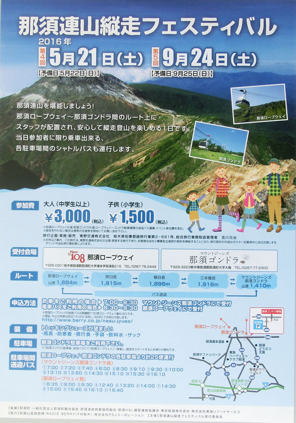 那須町も後援している第4回目の那須連山縦走フェスティバルが5月21日(土)に開催されます。那須ロープウェイから茶臼岳、朝日岳、三本槍ヶ岳経由マウントジーンズゴンドラまでと、その逆のコースを行く縦走です。初心者はロープウェイからのコースがお薦めです。ロープウェイ駅とゴンドラ駅の間を往復する臨時バスが運行されます。