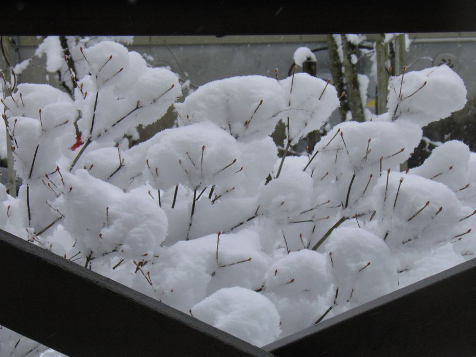今回の雪は自然村のあちらこちらで白いお花が咲いていました。重く湿っていたためでしょう。雪かきをしながら結構楽しめました。