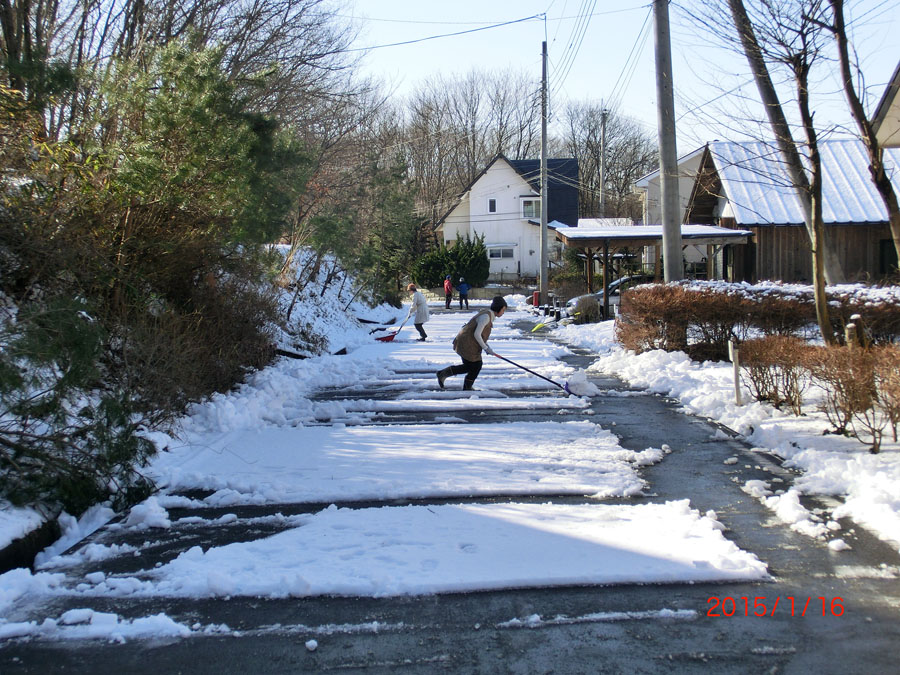 昨日雪情報1でお知らせした自然村の道路の雪は、昨日の内にメイン道路は全て除雪が終わり、安全に通れる様になりました。しかし脇道にはまだ雪が残っており、除雪が行われた道(西口からの道)でも残った雪が夜間には凍結する恐れもあり、通行には注意が必要です。また昭和門からの道は通行止めになっています。