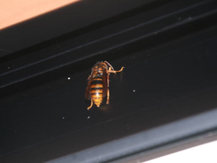左の写真は5年前5月22日に、間違えて家の中に飛び込んできたキイロスズメバチの女王蜂です。写すときは怖かったですね。巣は早期発見が大切。小さい内は自分で簡単に排除できます。特に留守?の日が多い別荘の方はご注意ください。
