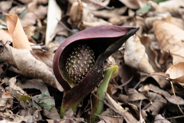 立春の頃から湿地の中にひっそりと咲き始める坐禅草。