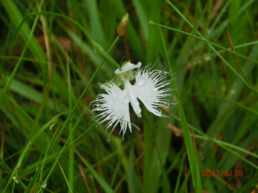 サギソウは植木鉢で見るものと決まっているようですが、全国的にも見学できる自生地は少なく貴重です。場所は、自然村平成門から車で10分、国道294号の寄居へ抜ける県道の途中の笹平湿地で、木道が整備され、誰でも気軽に見学できます。 サギソウの開花期は7月中旬〜9月上旬、ラン科なので1つの花の開花期間は長く約10日〜2週間あり、8月いっぱいが最盛期で、順次咲きます。昨年は開花している花が少なかったのですが、今年は湿地の中の方まで咲いていて数が少し増えた様な気がします。撮影した日は小雨が降っていて雨に濡れた花が重たげでした。