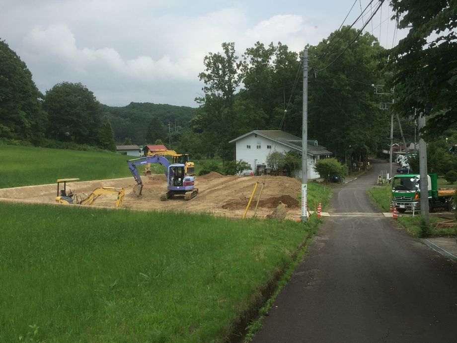 [写真左] 自然村にはキジがたくさんいますが、先日親子連れのキジが砂浴びのような遊びをしているところをみかけました。[写真中] 新管理事務所用地の造成工事が黒磯の土木屋さんにより始まっています。舗装(一部)・排水まで含め、一カ月はかかる大工事です。[写真右] 村内各所でアジサイが咲いていると先週お知らせしましたが、群星の丘のMさんの庭に見事な大輪のアジサイを見つけました。25センチもあり、北アメリカ東部原産でその名はアメリカノリノキ、ずばりアメリカアジサイとも呼ばれます。