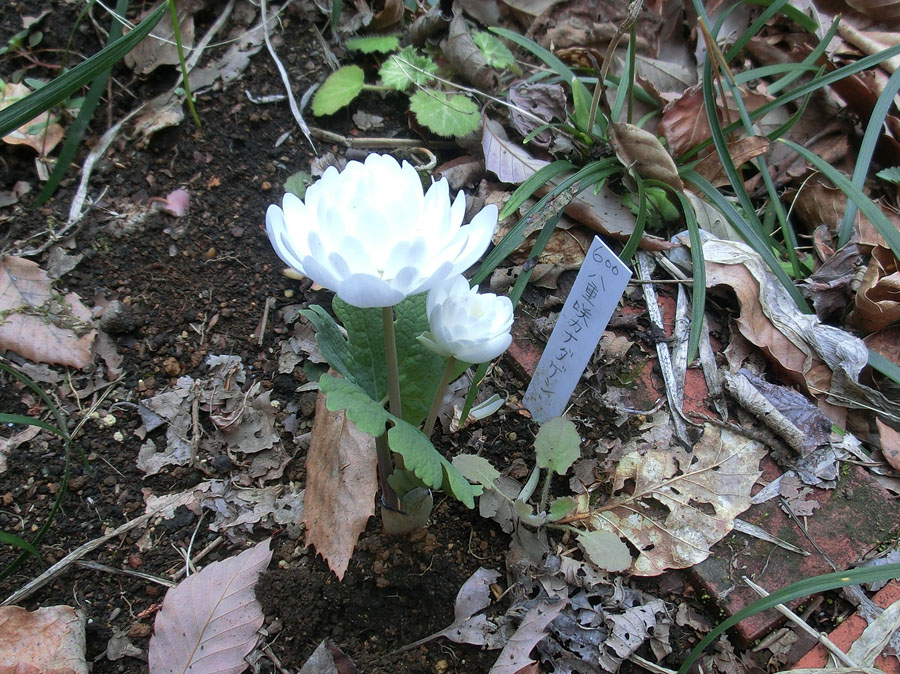 [写真右] 自然村の創始園にある鈴木正幸さんの庭に昨年植えた八重咲きカナダケシが純白の花を咲かせました。この花は一枚の葉っぱが花を包み込む様に成長する面白い花です。