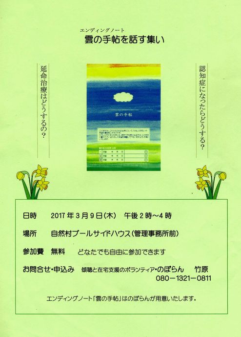 自然村にお住いの方々には終活を始めるきっかけになる講座が自然村プールハウス2階で9日(木)に開かれます。終活(しゅうかつ)とは「人生の終わりのための活動」の略で、人間が人生の最期を迎えるにあたって執る様々な準備やそこに向けた人生の総括を意味し、平成21年に『週刊朝日』から生み出された言葉。
