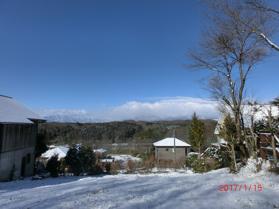 昨日14日(土)から降ったり止んだの雪が夜の内に5,6a程積もっていました。7時の気温は−6,5℃で今年一番の冷え込みでした。雪質は、サラサラの粉雪で陽の当たっている屋根や道路は少しずつ溶けて来ていますが、日陰等は気温が低いためなかなか溶けません。車の通行は基本4WDの雪用タイヤが安心です。夜にはまた凍結すると思われますので車での通行は十分注意して下さい。