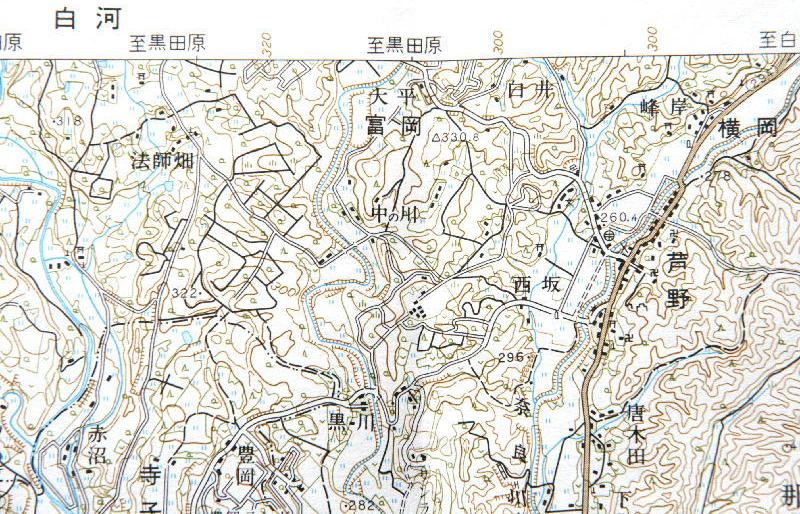 <参考> 写真は国土地理院発行5万分の1地形図(大田原)の一部、芦野・富岡付近。地図に興味ある方は、同院の電子地図閲覧サービス2万5000分の1地形図URLを以下に記すので自然村付近の地名探索を楽しんで下さい。