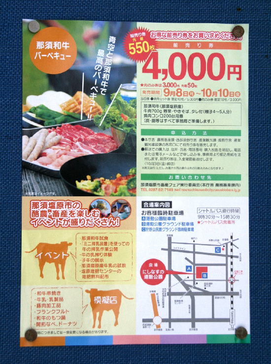 会場はおなじみ長寿センター前の「にしなすの運動公園」です。催し物も多彩で興味深いが、魅力は那須和牛700グラムのバーべキューセット5000円。前売り券を買えば4000円!上掲の下のポスターをじっくり読んで申し込みましょう。メールでも受付けています。