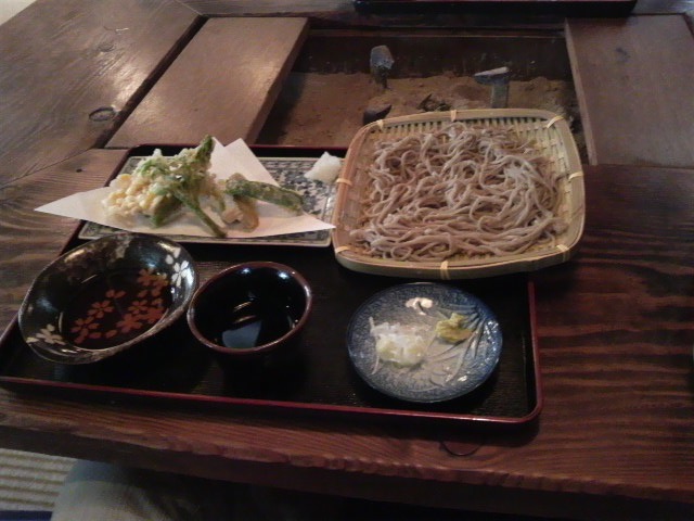 うだつの上がった小さなお店。囲炉裏があり雰囲気が良く期待感が高まる。うまいと聞いてきたからだ。お蕎麦は山菜天ざるそば(1000円)を注文。ちょっと季節はずれのためか具材はウド、ピーマン、かぼちゃ、アスパラ、ナス、もろこし...なんだ、野菜天じゃん。でも天つゆが別に用意されているので許しましょう。